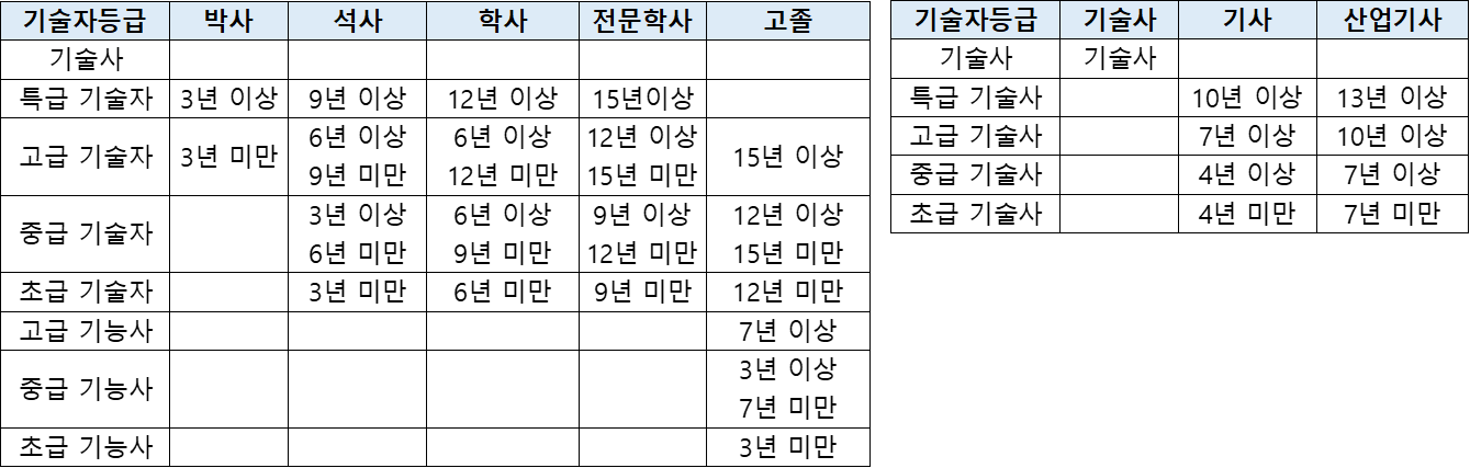 | 중급 기술자 | 기사자격 취득 후 4년 이상의 실무경력자 | 석사학위 취득 후 3년 이상의 실무 경력자 |